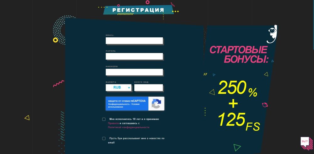 На стартовой странице официального сайта закреплено две кнопки со словом регистрация. Независимо от того на какую кнопку нажмет будущий пользователь Буй, загрузится форма с доступными вариантами: